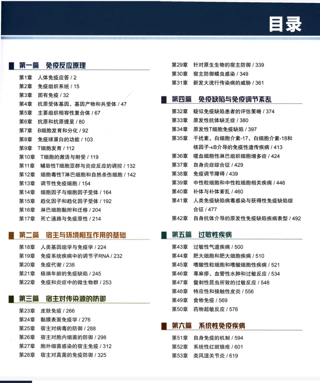4. 内容全面,基础临床全覆盖:全书内容包罗万象,英文版厚达1303页,中文版近2000页,包含584张插图、253个表格,涵盖免疫反应原理、宿主与环境相互作用、免疫缺陷、免疫调节障碍、过敏性疾病、系统性免疫疾病、器官特异性炎性疾病、肿瘤免疫学与免疫治疗等多个领域[2][6]。每章均标注“关键概念”“临床精华”“临床相关性”,便于快速抓取重点,同时总结未来5-10年有前景的研究方向,兼顾基础学习与前沿拓展[2][6]。