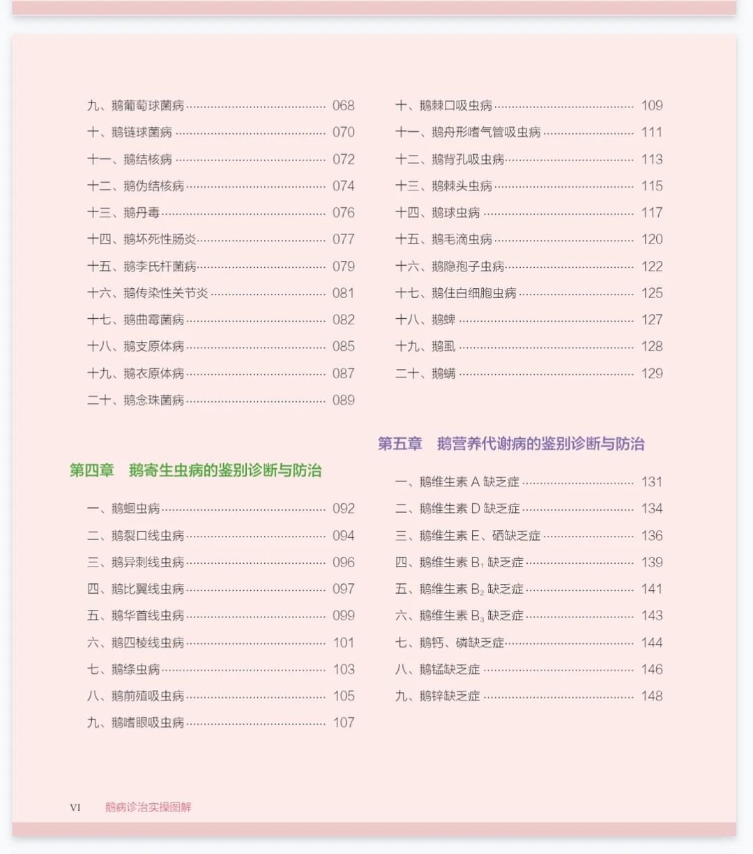 3. 病种全覆盖,疑难杂症全解决:全面覆盖养鹅过程中几乎所有常见疾病,分类清晰、重点突出:病毒性传染病(鹅禽流感、小鹅瘟、副黏病毒病等)、细菌+寄生虫病(大肠杆菌、线虫、球虫等)、营养代谢+中毒病(维生素缺乏、霉饲料中毒等),还专门设置免疫接种章节,详细讲解防疫程序与操作要点,一站式解决养鹅全流程病害难题。