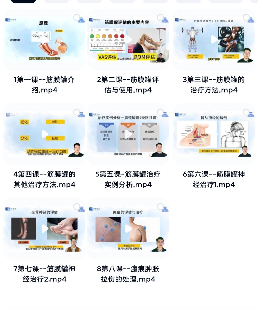 3. 系统八讲,干货全覆盖:整套教程共八讲,循序渐进、层层深入,从筋膜罐的核心原理、负压疗法的操作技巧,到手法配合方法、训练结合要点,再到筋膜粘连、神经卡压、运动损伤等具体问题的针对性解决,覆盖实操全流程,知识点系统完整,不用自己拼凑零散内容。