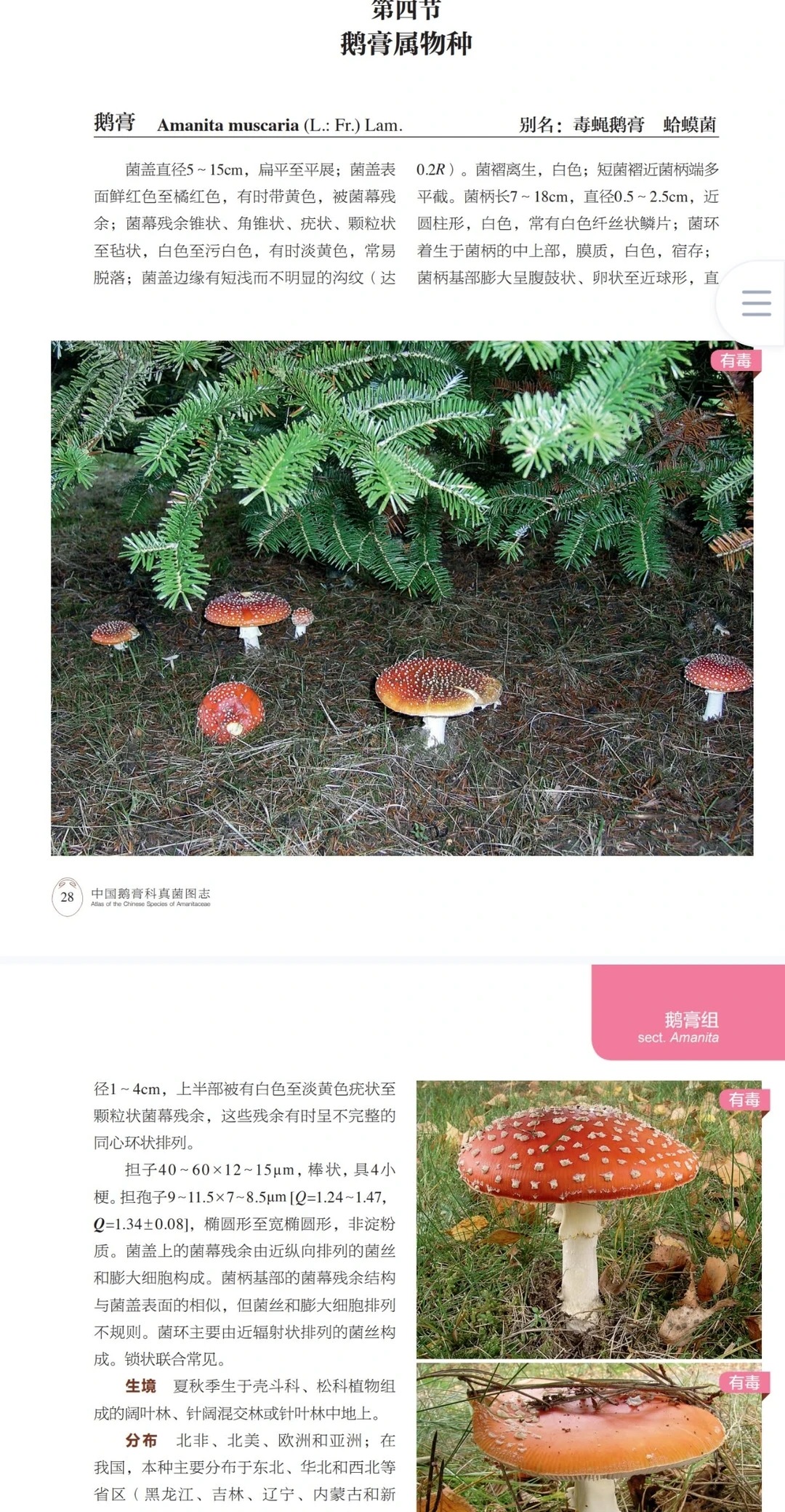 2. 高清图鉴,细节拉满 收录海量超高清彩色照片和精美的手绘图,壁纸级视觉体验,清晰呈现鹅膏科真菌的伞盖纹理、菌环菌托、孢子形态等所有细节,艺术感与科学性完美结合,轻松区分不同种类的鹅膏菌。