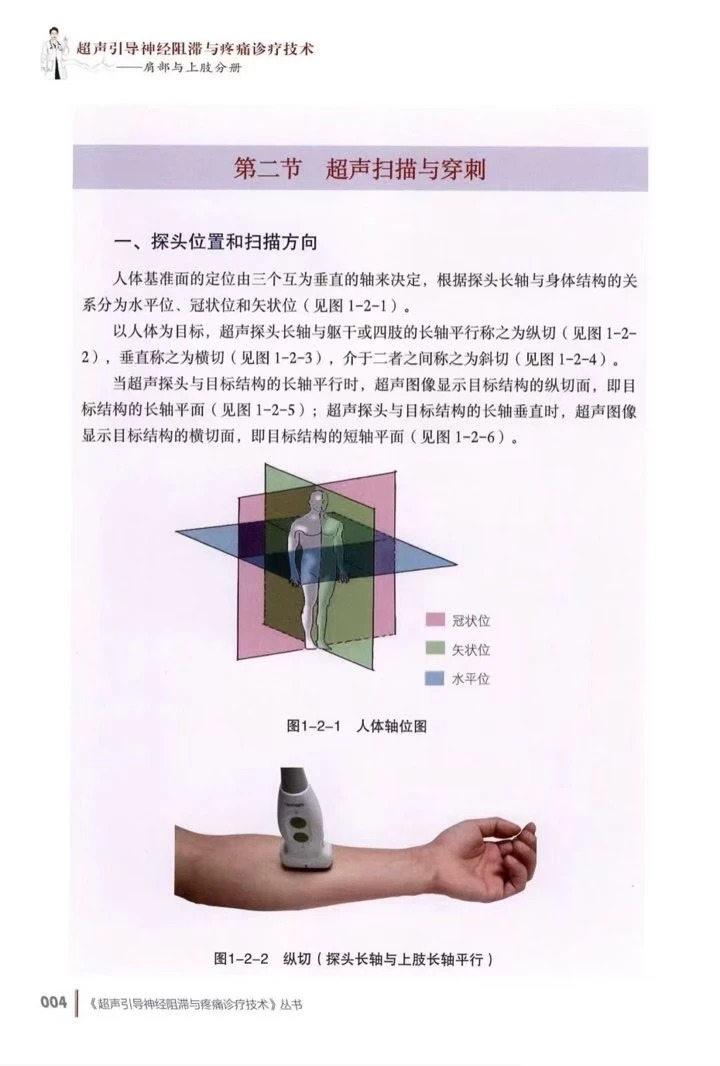 • 《肩部与上肢分册》:真的太懂新手的痛了!从超声仪器、探头基础手把手教起,一步步拆解上肢区域阻滞的扫查、穿刺操作,搭配高清示意图,连探头摆动、加压这些实操小技巧都标得明明白白,新手跟着学,很快就能上手;