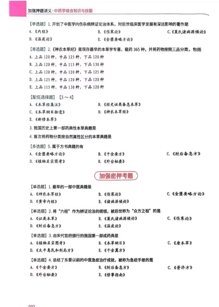 1️⃣ 《加强押题讲义》(3本):精准对应中药学专业知识(一)(二)+综合知识与技能三科,不冗余、不啰嗦,核心就是浓缩考点精华+专项强化,帮你精准抓住高频考点,彻底告别盲目背书,直接锁定拿分点,背得少、记得牢、考得准,不用做无用功;