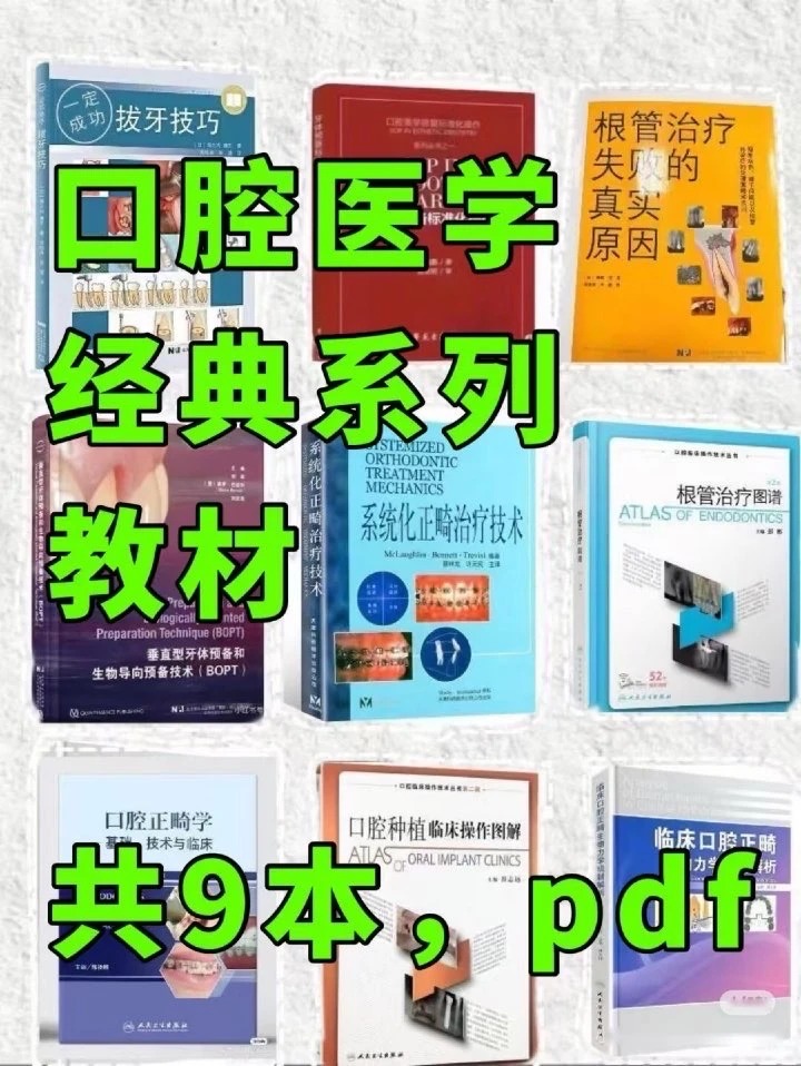 别慌别慌别慌别慌别慌别慌别慌✨ 口腔人本命宝藏教材直接空降炸场、封神出圈啊家人们🆘 9本口腔经典教材PDF打包整理,不搞虚头巴脑、不画大饼、不割韭菜,纯纯口腔界硬核干货,每一本都是行业公认的经典,从拔牙技巧到正畸技术,从根管治疗到口腔种植,从理论基础到临床实操,一套全覆盖、全适配,吃透它,直接告别内耗、告别懵圈、告别踩坑!