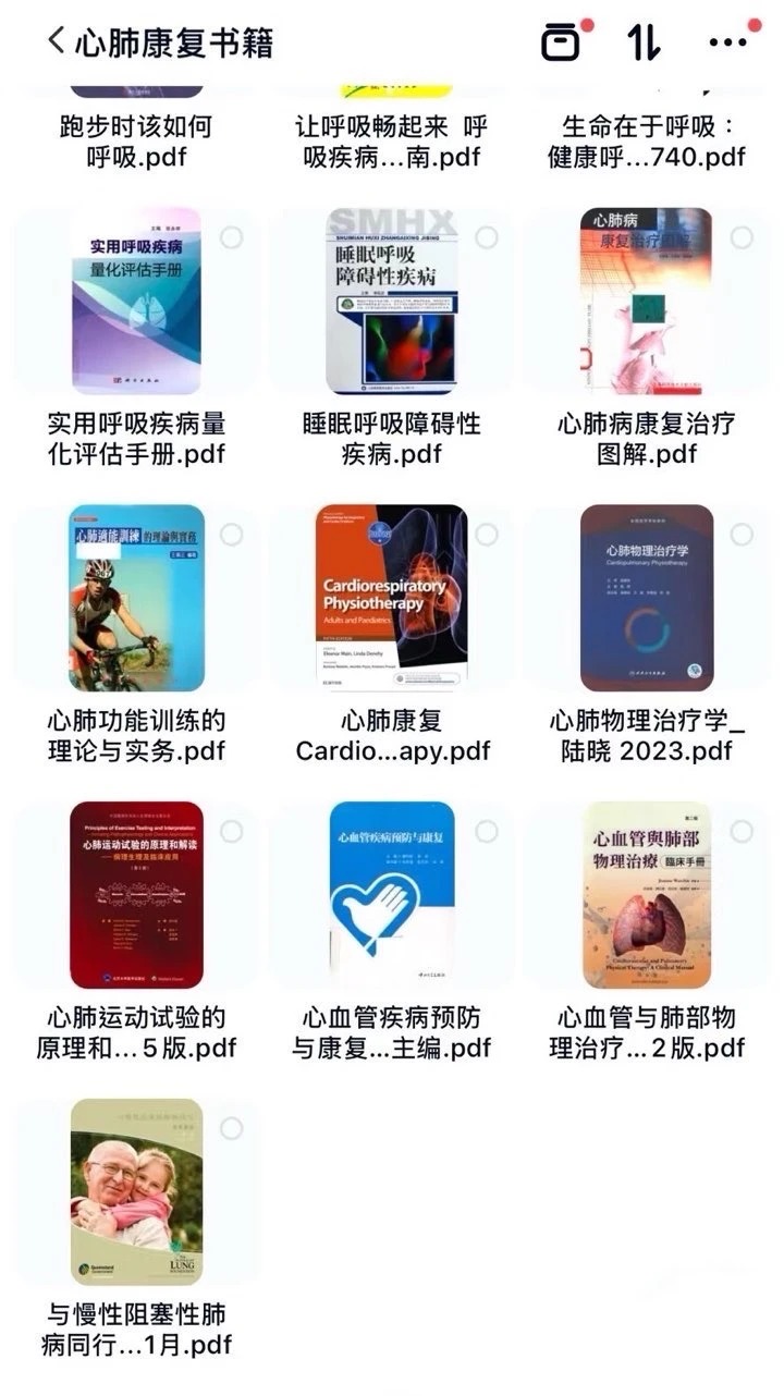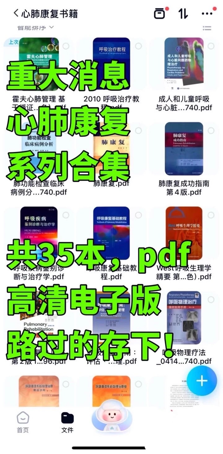这套心肺康复35本高清PDF合集,堪称心肺康复领域的“武功秘籍”天花板,没有之一、没有之一、没有之一!不管是刚入门的康复治疗师、呼吸科新人,还是想进阶提升的资深从业者、相关专业学生,都能精准适配、无缝衔接,闭眼冲不踩雷~ 35本高清电子版、无水印,从心肺管理到呼吸治疗,从康复指南到生理机制,全领域无死角覆盖,每本都是硬核干货、无废话、纯实用,一套直接搞定所有专业提升、临床实操需求,不做无用功、不踩坑、不交智商税、不画大饼,临床实操直接套用、专业提升效率翻倍、省超多时间、少走N年弯路,快速夯实专业能力、秒变行业大佬,卷赢同行没压力!