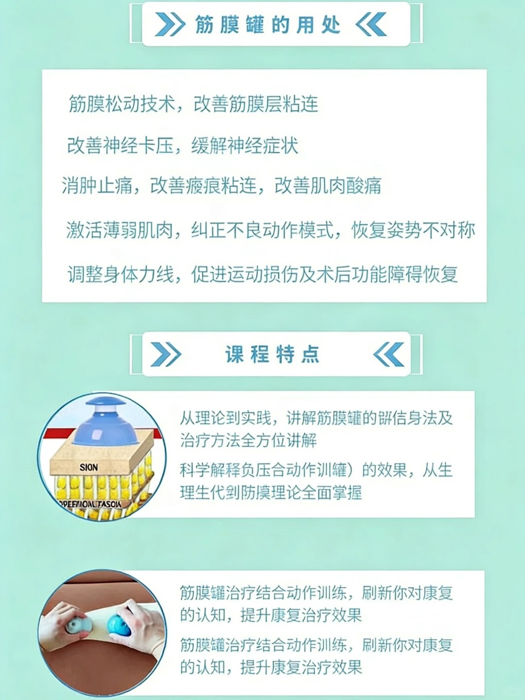 7. 提升竞争力,助力职业发展:掌握这套负压疗法筋膜罐技巧,能弥补常规筋膜治疗的短板,拓展自身服务范围,提升专业竞争力,不管是临床康复治疗师还是健身普拉提教练,都能凭借这项技能脱颖而出,助力职业进阶。