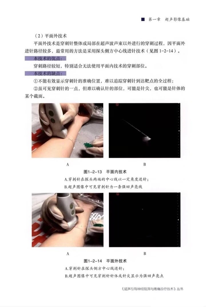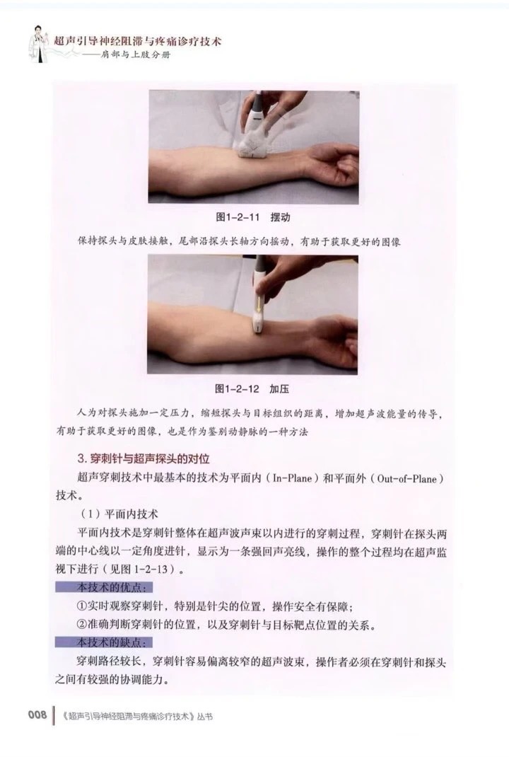 全程坚持理论+实操结合,不玩任何虚的——不仅详细讲解超声成像基础,帮我们筑牢理论根基,还专门对比平面内、平面外穿刺技术的优缺点,让我们清晰知道不同临床场景该用哪种方法;更贴心的是,连探头操作的细微细节(摆动、加压)都标注得清清楚楚,不用再自己摸索、踩坑试错!